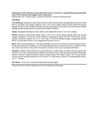 Mawa A P, Nandita and Anjani, Gemala and Widyastuti, Nurmasari and Ayustaningwarno, Fitriyono Kandungan Zat Besi, Kalsium, dan Karakteristik Sensoris Cream Cheese Analog Berbasis Kacang Kedelai (Glycine Max) dan Kacang Tunggak (Vigna Unguiculata). -. (Unpublished)