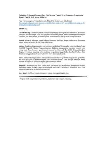 Tri Ayuningtiyas, Fajar and Probosari, Enny and Tri Susilo, Mursid and Rahadiyanti, Ayu Hubungan Frekuensi Konsumsi Junk Food dengan Tingkat Nyeri Dismenore Primer pada Remaja Putri di SMP Negeri 8 Cilacap. -. (Unpublished)