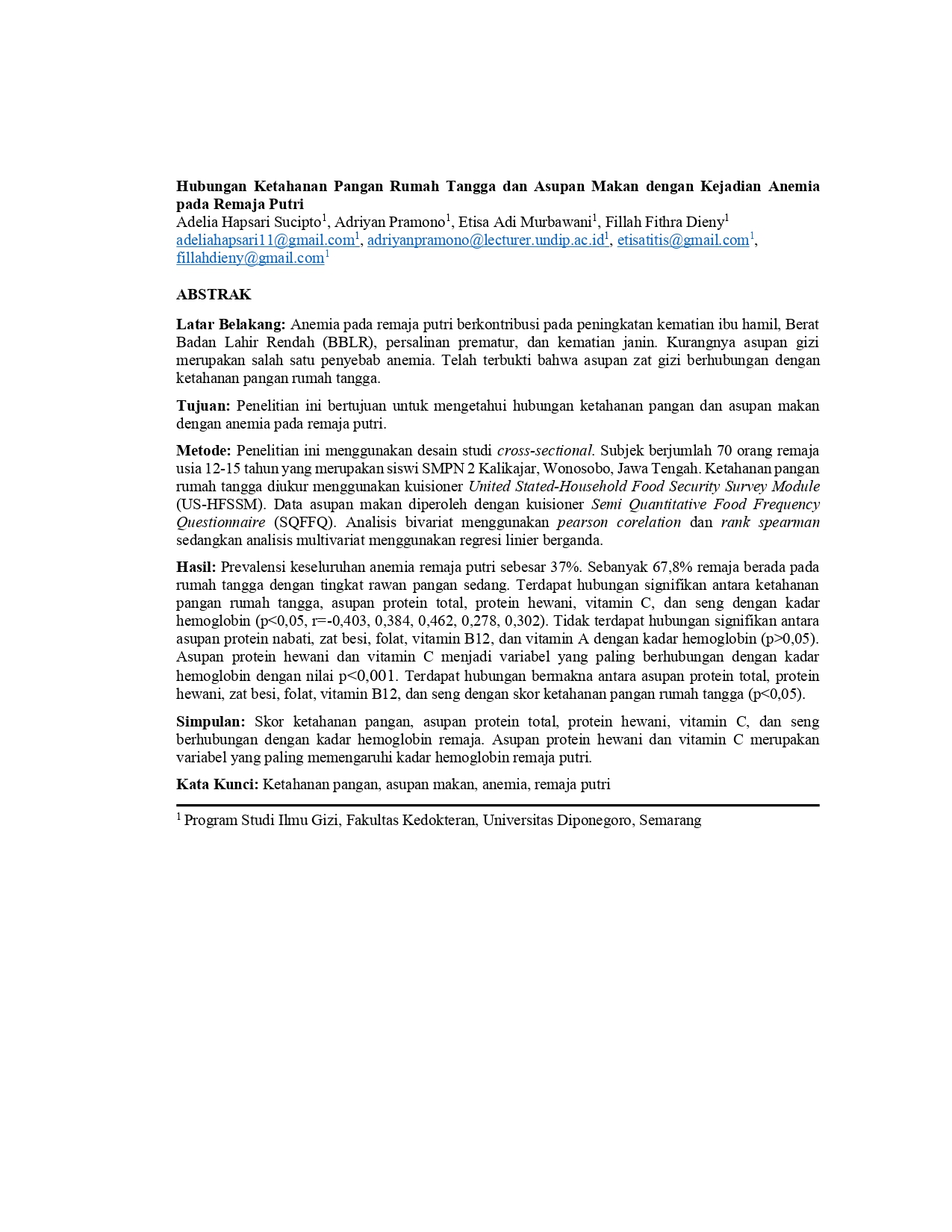 Hapsari Sucipto, Adelia and Pramono, Adriyan and Adi Murbawani, Ninik and Fithra Dieny, Fillah Hubungan Ketahanan Pangan Rumah Tangga dan Asupan Makan dengan Kejadian Anemia pada Remaja Putri. -. (Unpublished)