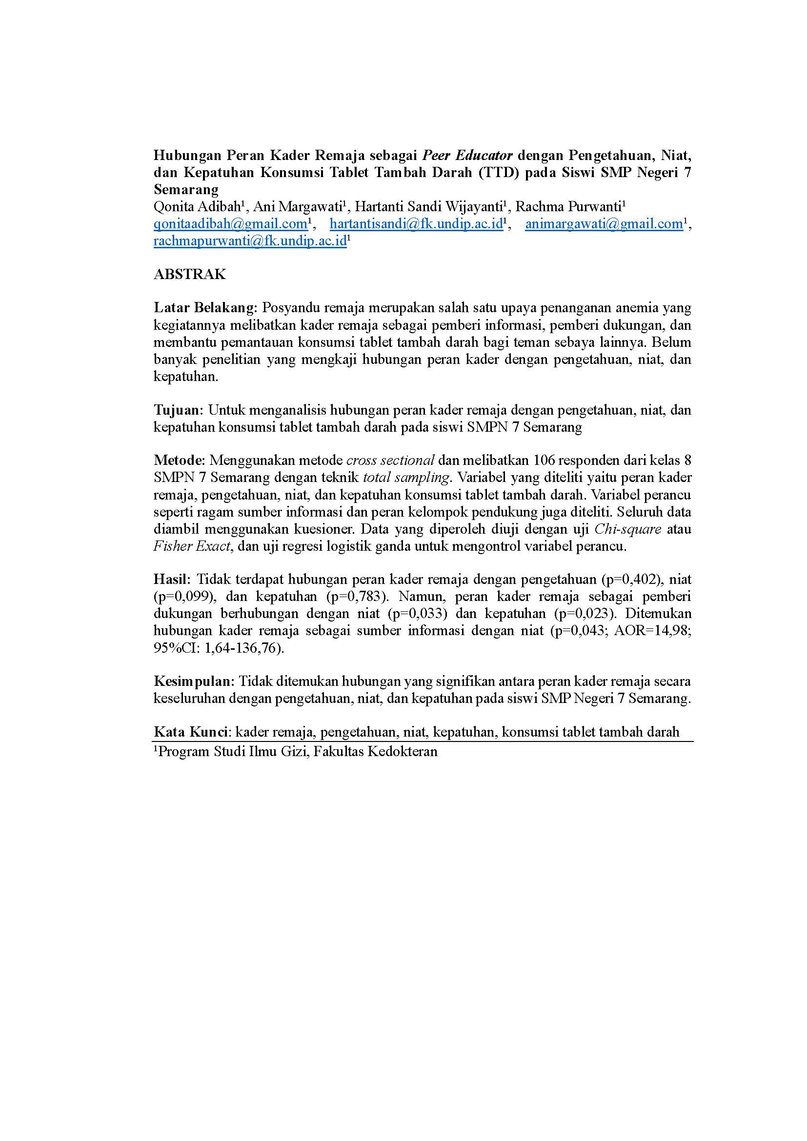 Adibah, Qonita and Margawati, Ani and Sandi Wijayanti, Ayu and Purwanti, Rachma (2023) Hubungan Peran Kader Remaja sebagai Peer Educator dengan Pengetahuan, Niat, dan Kepatuhan Konsumsi Tablet Tambah Darah (TTD) pada Siswi SMP Negeri 7 Semarang. -. (Unpublished)