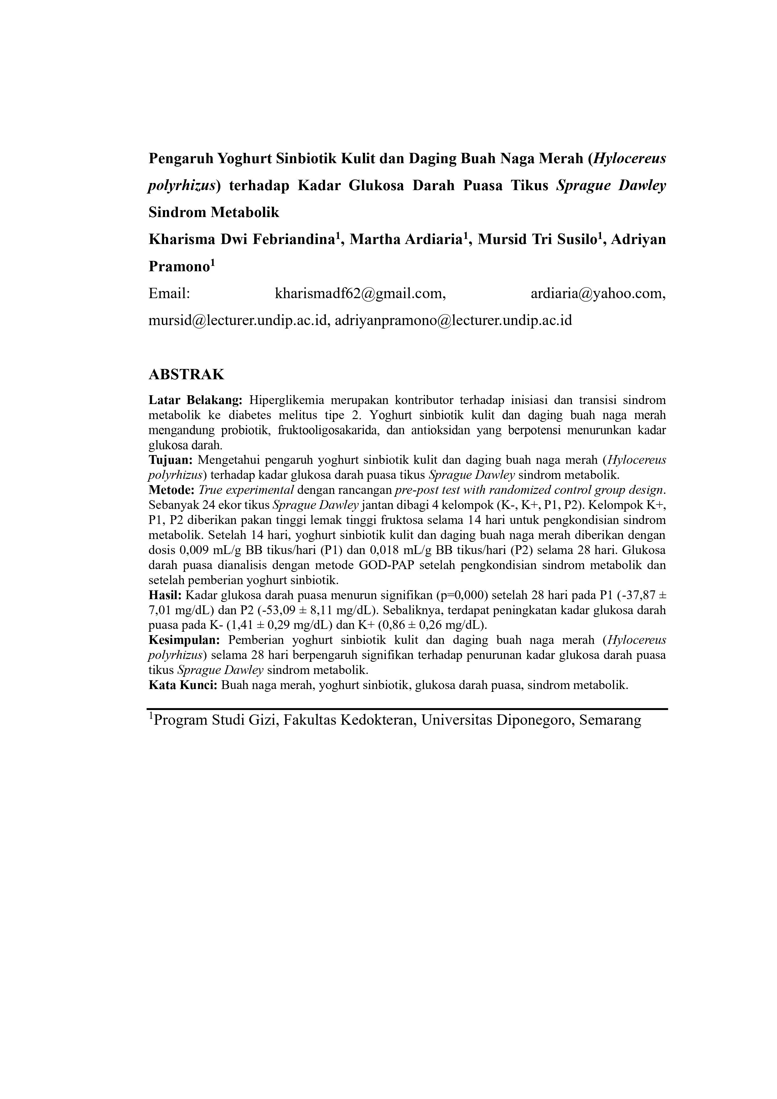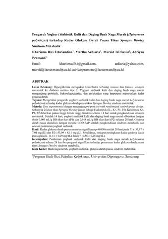 Dwi Febriandina, Kharisma and Ardiaria, Martha and Tri Susilo, Mursid and Pramono, Adriyan Pengaruh Yoghurt Sinbiotik Kulit dan Daging Buah Naga Merah (Hylocereus polyrhizus) terhadap Kadar Glukosa Darah Puasa Tikus Sprague Dawley Sindrom Metabolik. -. (Unpublished)
