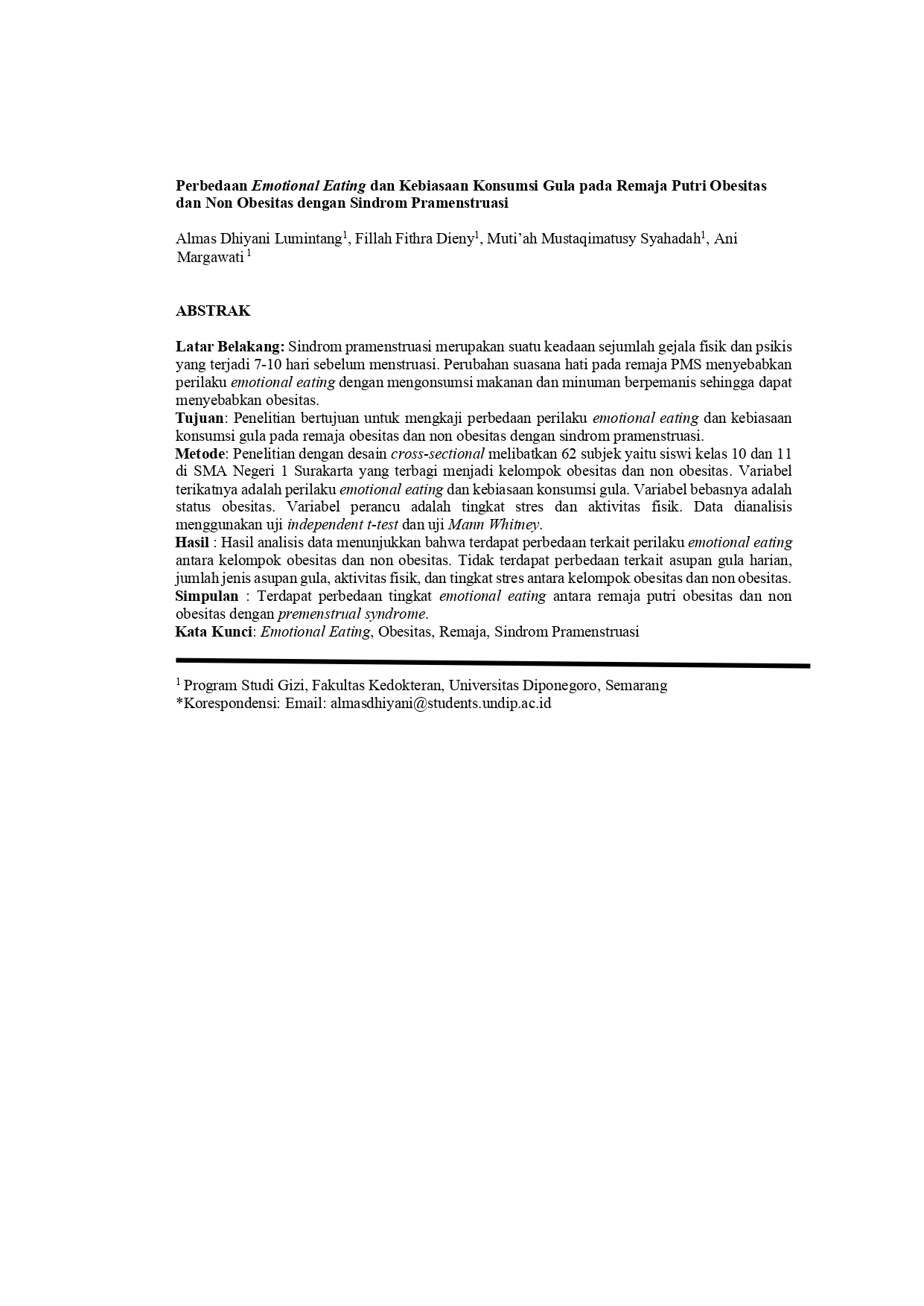 Dhiyani Lumintang, Almas and Fithra Dieny, Fillah and Mustaqimatusy Syahadah, Muti’ah and Margawati, Ani Perbedaan Emotional Eating dan Kebiasaan Konsumsi Gula pada Remaja Putri Obesitas dan Non Obesitas dengan Sindrom Pramenstruasi. -. (Unpublished)