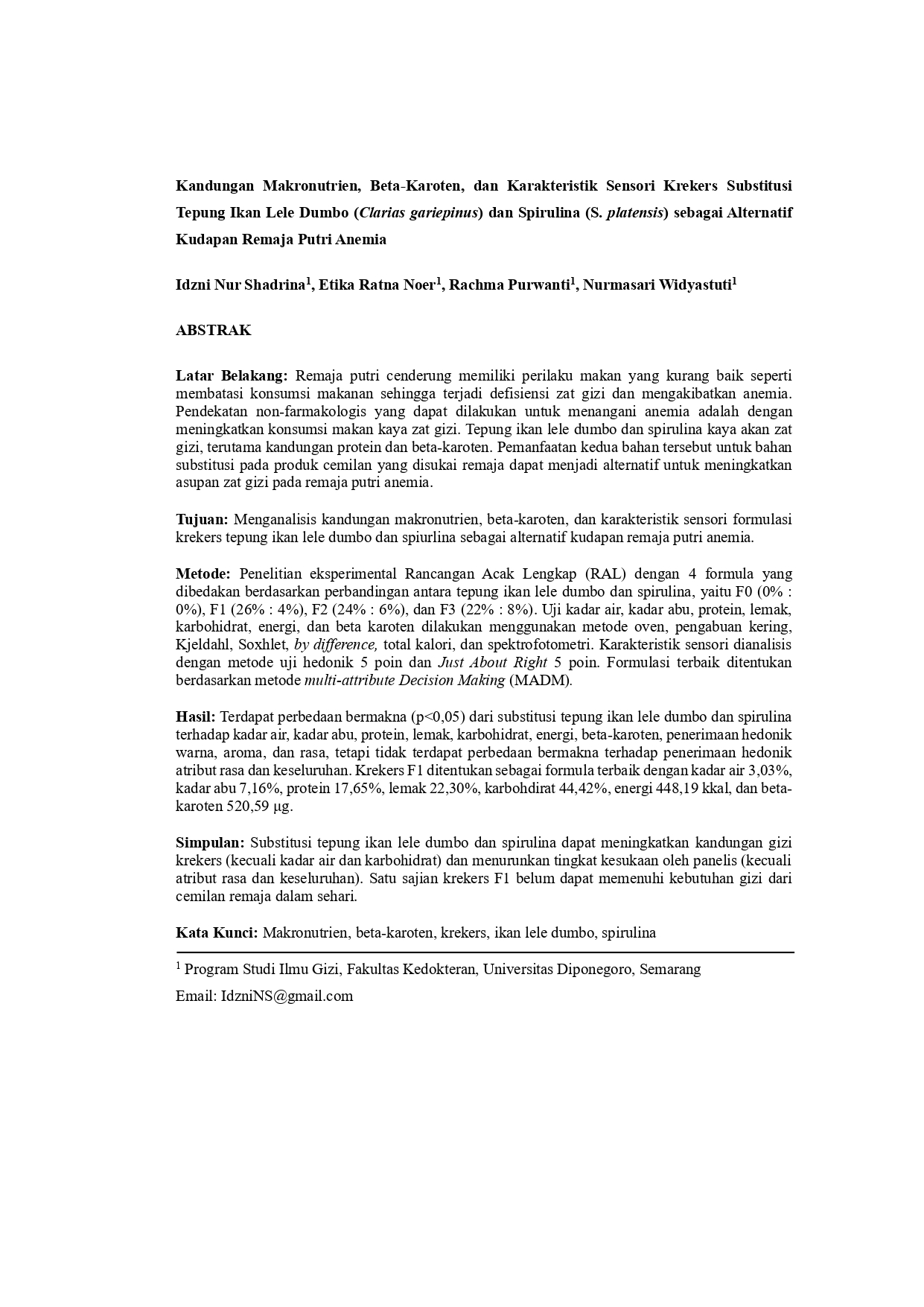 Nur Shadrina, Idzni and Ratna Noer, Etika and Purwanti, Rachma and Widyastuti, Nurmasari Kandungan Makronutrien, Beta-Karoten, dan Karakteristik Sensori Krekers Substitusi Tepung Ikan Lele Dumbo (Clarias gariepinus) dan Spirulina (S. platensis) sebagai Alternatif Kudapan Remaja Putri Anemia. -. (Unpublished)