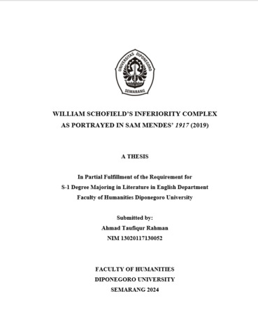 Rahman, Ahmad Taufiqur (2024) WILLIAM SCHOFIELD’S INFERIORITY COMPLEX AS PORTRAYED IN SAM MENDES’ 1917 (2019). Undergraduate thesis, Diponegoro University.