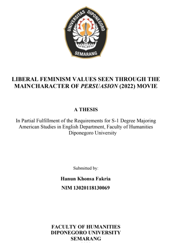 Fakria, Hanun Khonsa (2024) LIBERAL FEMINISM VALUES SEEN THROUGH THE MAINCHARACTER OF PERSUASION (2022) MOVIE. Undergraduate thesis, Diponegoro University.