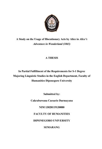 Darmayana, Cakrabuwana Caesario (2024) A Study on the Usage of Illocutionary Acts by Alice in Alice’s Adventure in Wonderland (1865). Undergraduate thesis, Diponegoro University.
