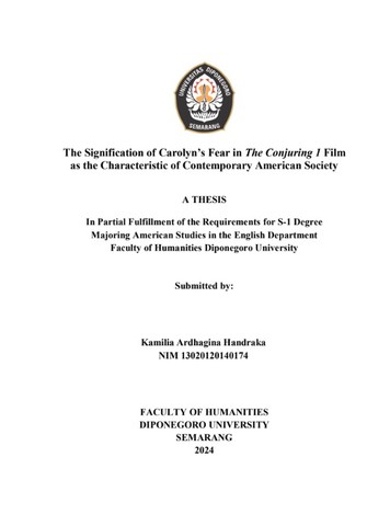 Handraka, Kamilia Ardhagina (2024) The Signification of Carolyn’s Fear in The Conjuring 1 Film as the Characteristic of Contemporary American Society. Undergraduate thesis, Diponegoro University.