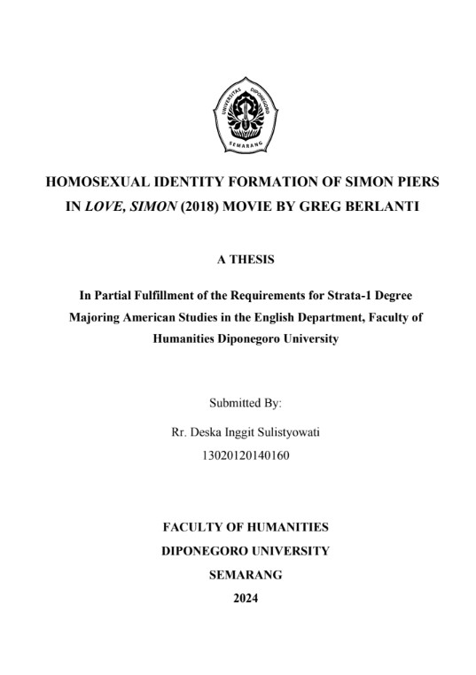 Sulistyowati, Rr. Deska Inggit (2024) HOMOSEXUAL IDENTITY FORMATION OF SIMON PIERS IN LOVE, SIMON (2018) MOVIE BY GREG BERLANTI. Undergraduate thesis, Diponegoro University.