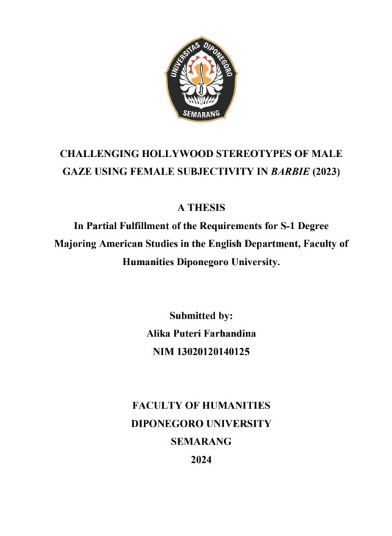 Farhandina, Alika Puteri (2024) CHALLENGING HOLLYWOOD STEREOTYPES OF MALE GAZE USING FEMALE SUBJECTIVITY IN BARBIE (2023). Undergraduate thesis, Diponegoro University.