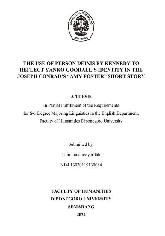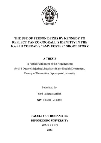 Lailatussyarifah, Umi (2025) THE USE OF PERSON DEIXIS BY KENNEDY TO REFLECT YANKO GOORALL’S IDENTITY IN THE JOSEPH CONRAD’S “AMY FOSTER” SHORT STORY. Undergraduate thesis, Diponegoro University.