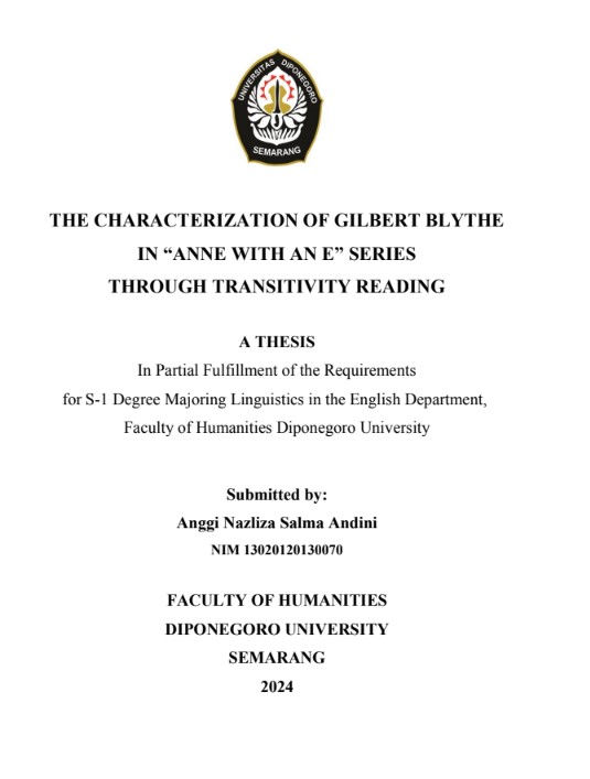 Andini, Anggi Nazliza Salma (2025) THE CHARACTERIZATION OF GILBERT BLYTHE IN “ANNE WITH AN E” SERIES THROUGH TRANSITIVITY READING. Undergraduate thesis, Diponegoro University.