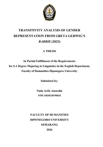 Amardin, Nada Arifa (2025) TRANSITIVITY ANALYSIS OF GENDER REPRESENTATION FROM GRETA GERWIG’S BARBIE (2023). Undergraduate thesis, Diponegoro University.