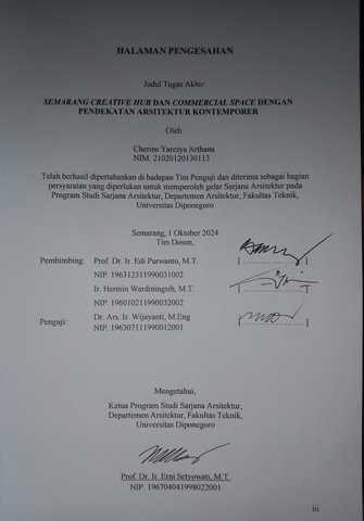 YARESYA ARTHANA, CHERINE (2024) SEMARANG CREATIVE HUB DAN COMMERCIAL SPACE DENGAN PENDEKATAN ARSITEKTUR KONTEMPORER. Undergraduate thesis, UNDIP.