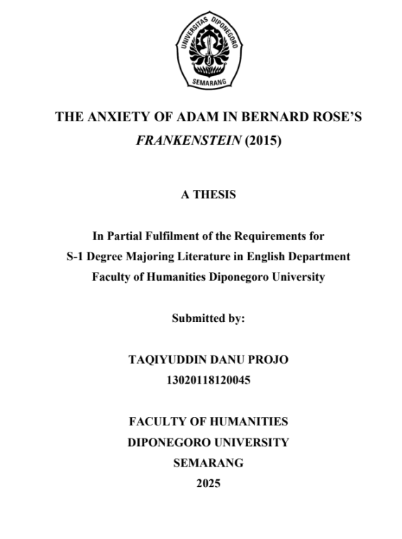 PROJO, TAQIYUDDIN DANU (2025) THE ANXIETY OF ADAM IN BERNARD ROSE’S FRANKENSTEIN (2015). Undergraduate thesis, Diponegoro University.