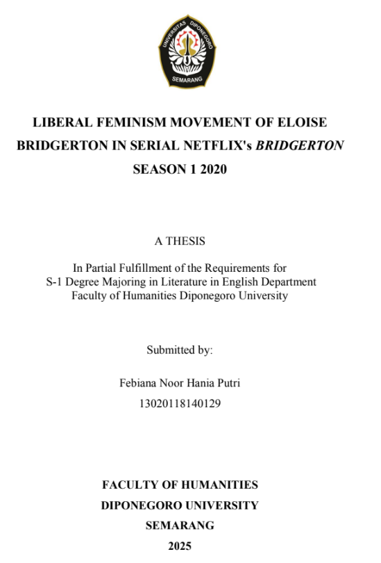 Putri, Febiana Noor Hania (2025) LIBERAL FEMINISM MOVEMENT OF ELOISE BRIDGERTON IN SERIAL NETFLIX's BRIDGERTON SEASON 1 2020. Undergraduate thesis, Diponegoro University.