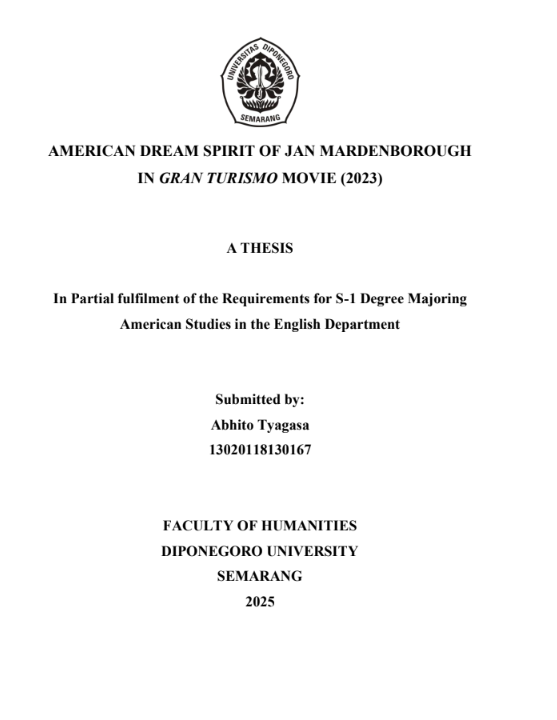 Tyagasa, Abhito (2025) AMERICAN DREAM SPIRIT OF JAN MARDENBOROUGH IN GRAN TURISMO MOVIE (2023). Undergraduate thesis, Diponegoro University.