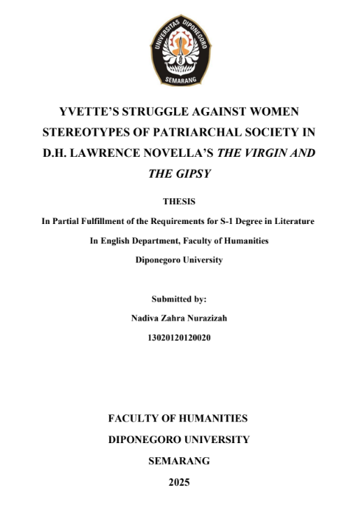 Nurazizah, Nadiva Zahra (2025) YVETTE’S STRUGGLE AGAINST WOMEN STEREOTYPES OF PATRIARCHAL SOCIETY IN D.H. LAWRENCE NOVELLA’S THE VIRGIN AND THE GIPSY. Undergraduate thesis, Diponegoro University.