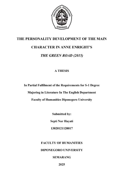 Hayati, Septi Nur (2025) THE PERSONALITY DEVELOPMENT OF THE MAIN CHARACTER IN ANNE ENRIGHT'S THE GREEN ROAD (2015). Undergraduate thesis, Diponegoro University.