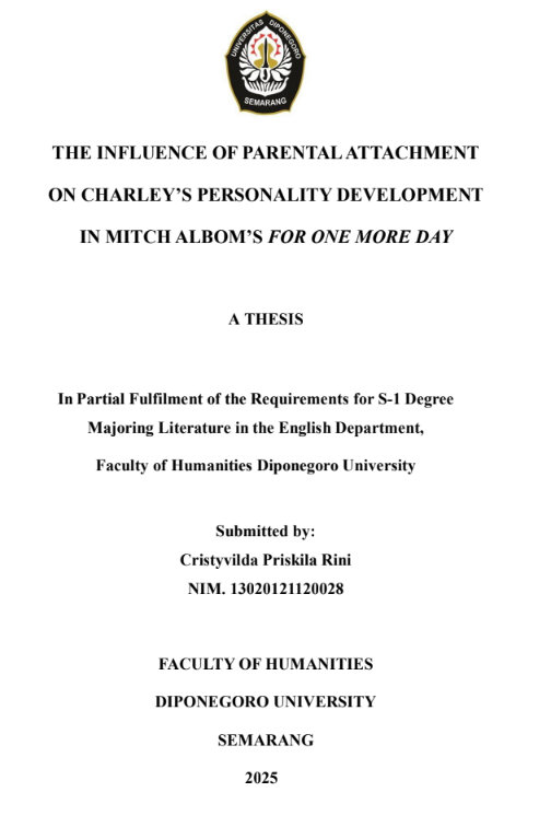 Rini, Cristyvilda Priskila (2025) THE INFLUENCE OF PARENTAL ATTACHMENT ON CHARLEY’S PERSONALITY DEVELOPMENT IN MITCH ALBOM’S FOR ONE MORE DAY. Undergraduate thesis, Diponegoro University.