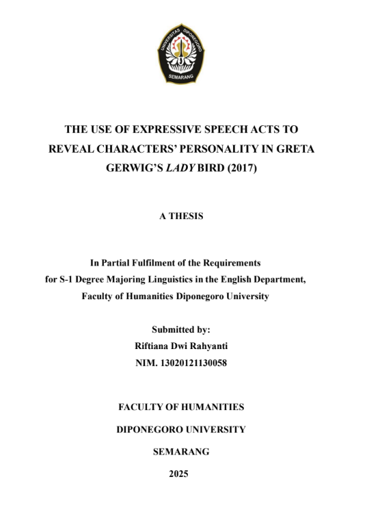 Rahyanti, Riftiana Dwi (2025) THE USE OF EXPRESSIVE SPEECH ACTS TO REVEAL CHARACTERS’ PERSONALITY IN GRETA GERWIG’S LADY BIRD (2017). Undergraduate thesis, Diponegoro University.