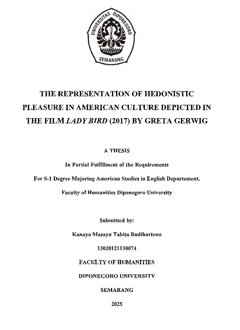 Budihartono, Kanaya Masayu Tabita (2025) THE REPRESENTATION OF HEDONISTIC PLEASURE IN AMERICAN CULTURE DEPICTED IN THE FILM LADY BIRD (2017) BY GRETA GERWIG. Undergraduate thesis, Diponegoro University.