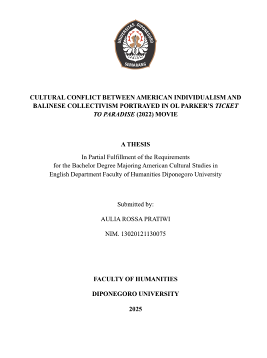 PRATIWI, AULIA ROSSA (2025) CULTURAL CONFLICT BETWEEN AMERICAN INDIVIDUALISM AND BALINESE COLLECTIVISM PORTRAYED IN OL PARKER’S TICKET TO PARADISE (2022) MOVIE. Undergraduate thesis, Diponegoro University.