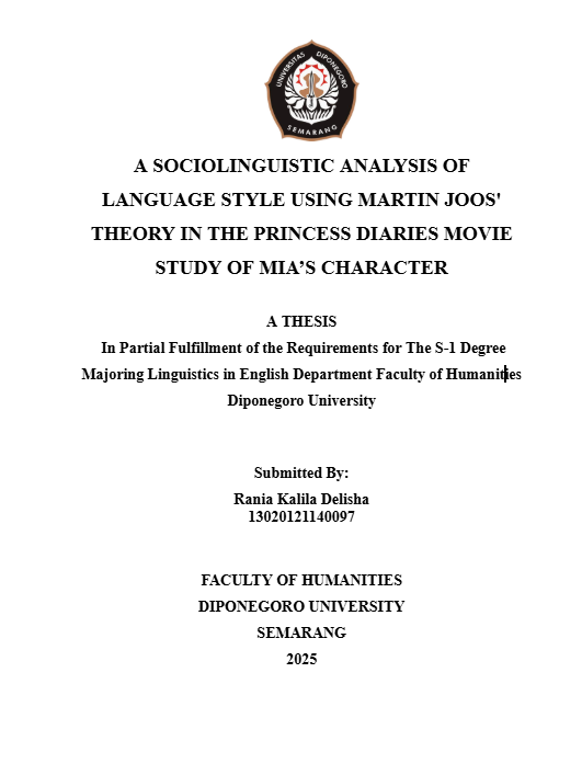 Delisha, Rania Kalila (2025) A SOCIOLINGUISTIC ANALYSIS OF LANGUAGE STYLE USING MARTIN JOOS THEORY IN THE PRINCESS DIARIES MOVIE STUDY OF MIA’S CHARACTER. Undergraduate thesis, Diponegoro University.