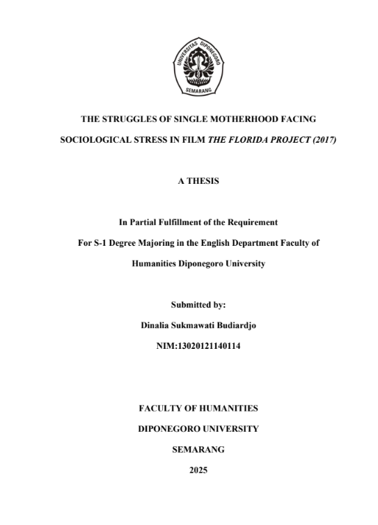 Budiardjo, Dinalia Sukmawati (2025) THE STRUGGLES OF SINGLE MOTHERHOOD FACING SOCIOLOGICAL STRESS IN FILM THE FLORIDA PROJECT (2017). Undergraduate thesis, Diponegoro University.