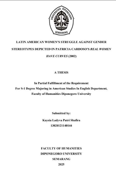 Shafira, Kaysia Ladyva Putri (2025) LATIN AMERICAN WOMEN’S STRUGGLE AGAINST GENDER STEREOTYPES DEPICTED IN PATRICIA CARDOSO’S REAL WOMEN HAVE CURVES (2002). Undergraduate thesis, Diponegoro University.