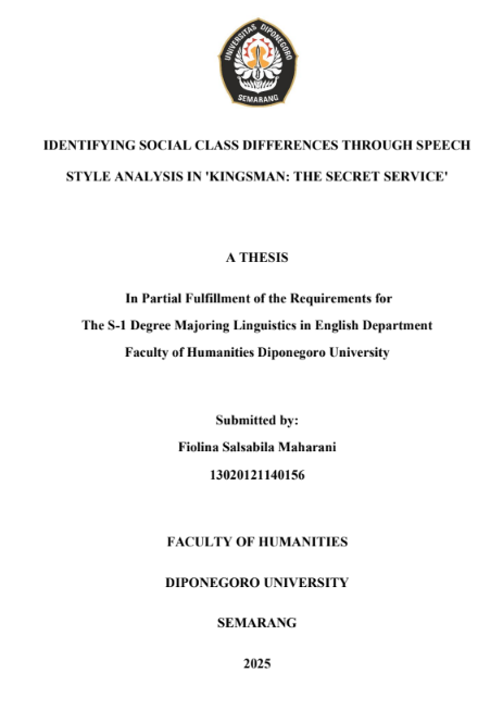Maharani, Fiolina Salsabila (2025) IDENTIFYING SOCIAL CLASS DIFFERENCES THROUGH SPEECH STYLE ANALYSIS IN 'KINGSMAN: THE SECRET SERVICE'. Undergraduate thesis, Diponegoro University.