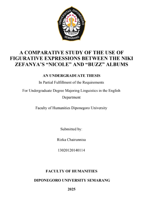 Chairunnisa, Rizka (2025) A COMPARATIVE STUDY OF THE USE OF FIGURATIVE EXPRESSIONS BETWEEN THE NIKI ZEFANYA’S “NICOLE” AND “BUZZ” ALBUMS. Undergraduate thesis, Diponegoro University.