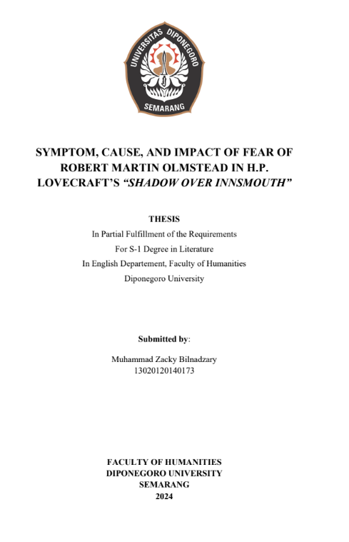 Bilnadzary, Muhammad Zacky (2025) SYMPTOM, CAUSE, AND IMPACT OF FEAR OF ROBERT MARTIN OLMSTEAD IN H.P. LOVECRAFT’S “SHADOW OVER INNSMOUTH”. Undergraduate thesis, Diponegoro University.