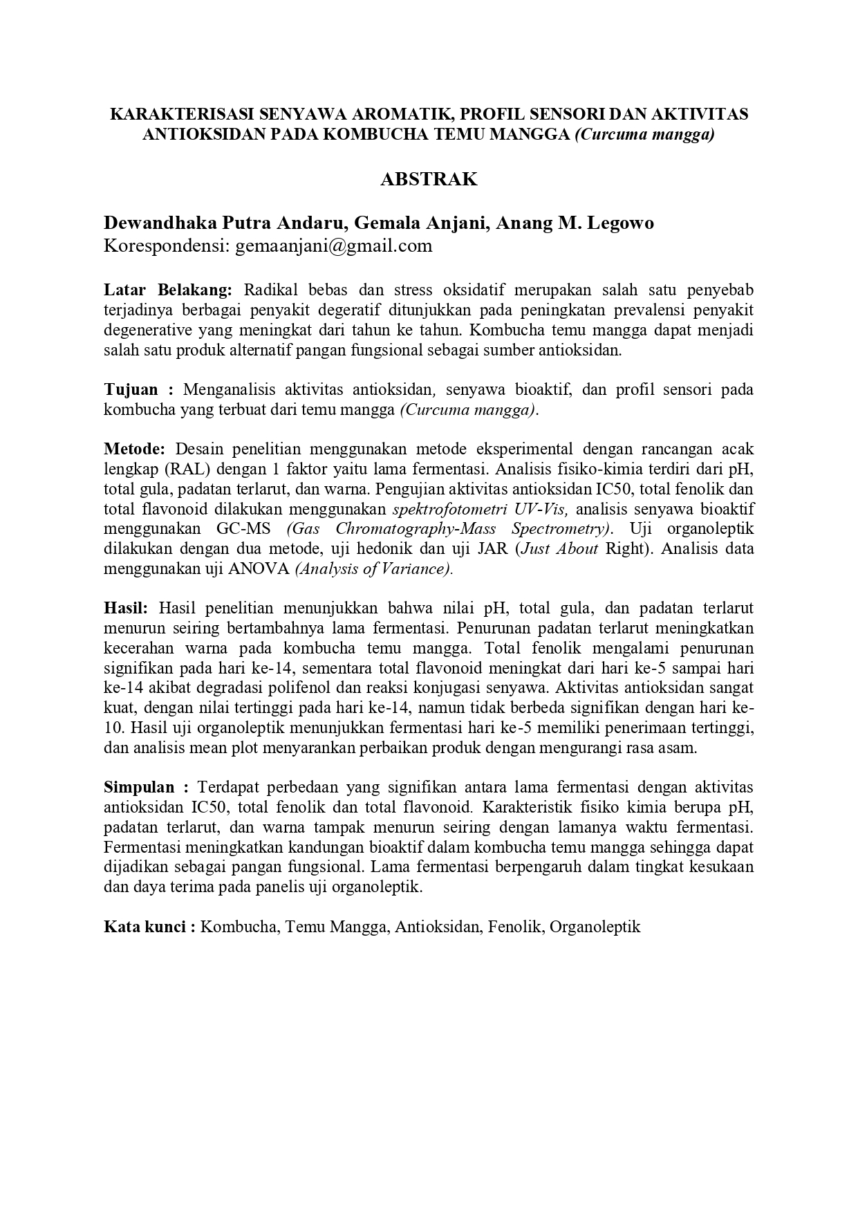 Putra Andaru, Dewandhaka and Anjani, Gemala and M. Legowo, Anang (2025) KARAKTERISASI SENYAWA AROMATIK, PROFIL SENSORI DAN AKTIVITAS ANTIOKSIDAN PADA KOMBUCHA TEMU MANGGA (Curcuma mangga). Masters thesis, Fakultas Kedokteran.