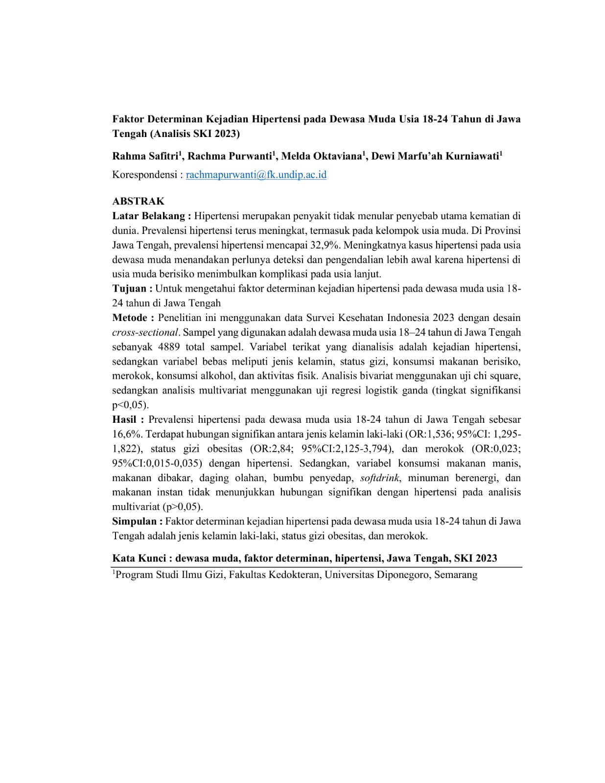 Safitri, Rahma and Purwanti, Rachma (2026) FAKTOR DETERMINAN KEJADIAN HIPERTENSI PADA DEWASA MUDA USIA 18-24 TAHUN DI JAWA TENGAH (ANALISIS SKI 2023). Undergraduate thesis, Fakultas Kedokteran.
