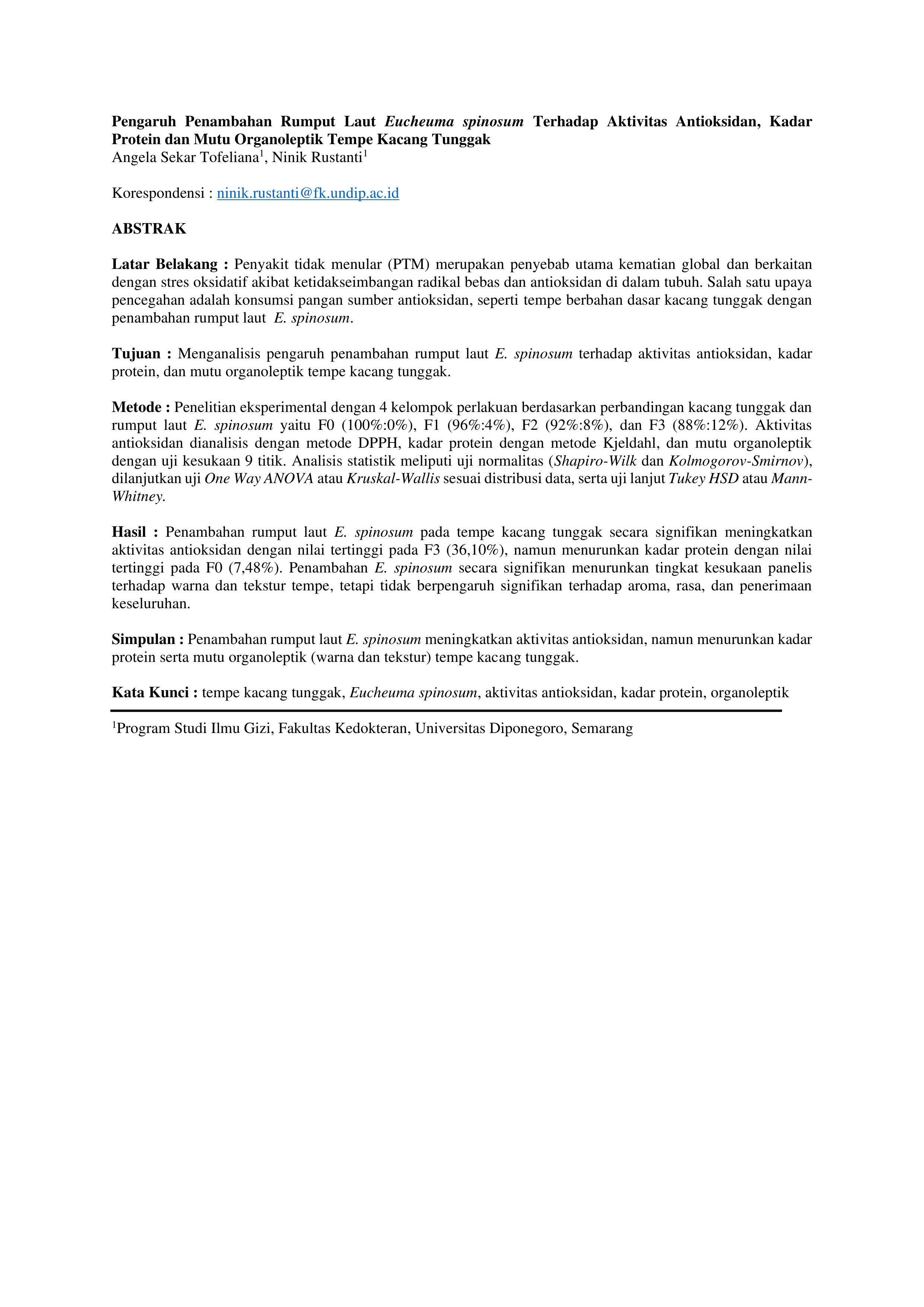 Tofeliana, Angela Sekar and Rustanti, Ninik (2026) PENGARUH PENAMBAHAN RUMPUT LAUT EUCHEUMA SPINOSUM TERHADAP AKTIVITAS ANTIOKSIDAN, KADAR PROTEIN DAN MUTU ORGANOLEPTIK TEMPE KACANG TUNGGAK. Undergraduate thesis, Fakultas Kedokteran.
