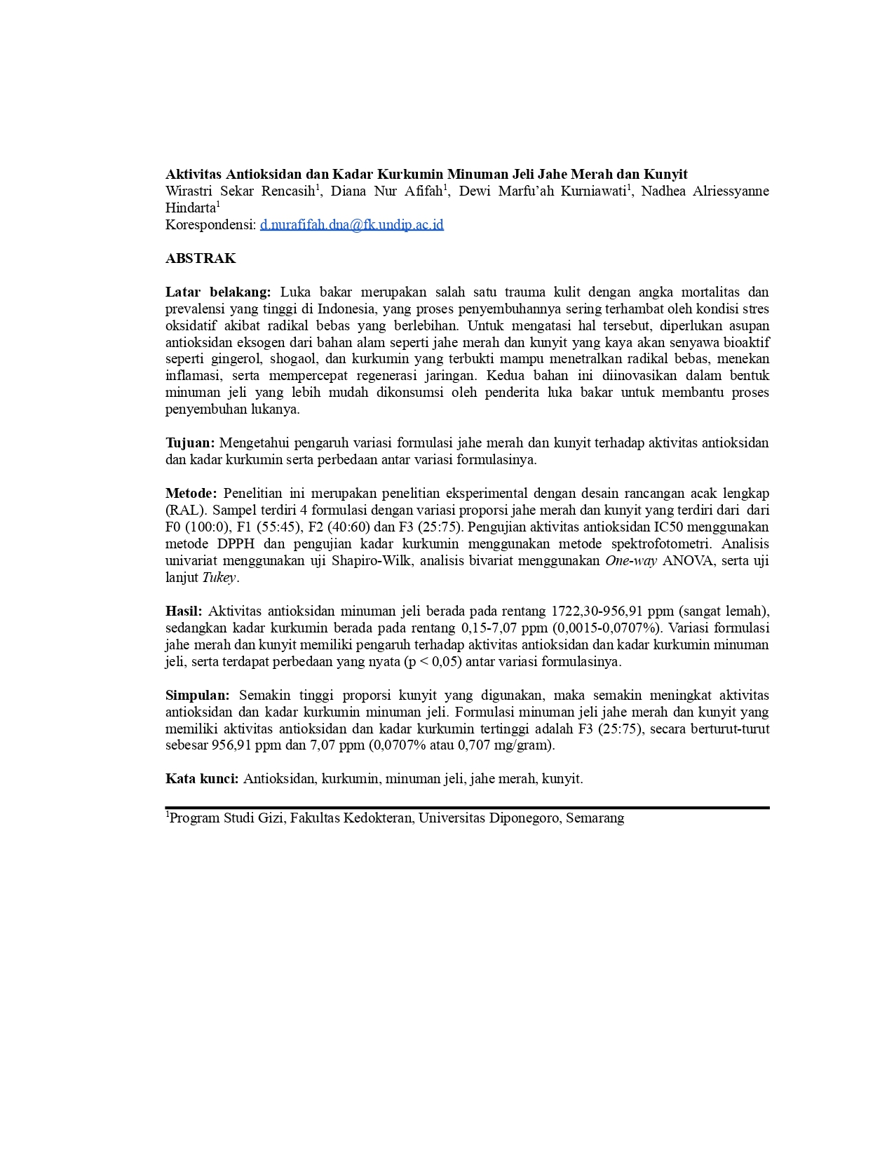 Rencasih, Wirastri Sekar and Afifah, Diana Nur (2026) AKTIVITAS ANTIOKSIDAN DAN KADAR KURKUMIN MINUMAN JELI JAHE MERAH DAN KUNYIT. Undergraduate thesis, Fakultas Kedokteran.