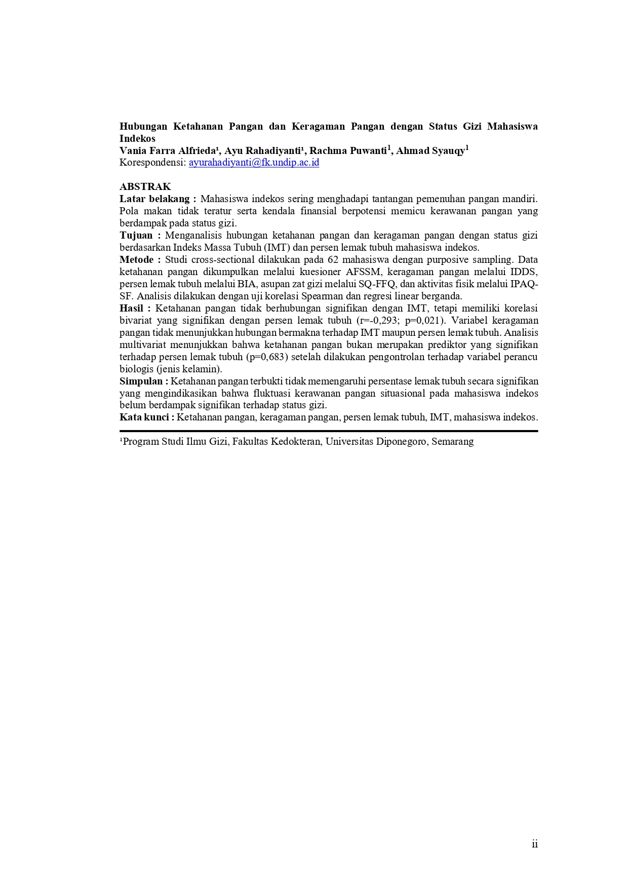 Alfrieda, Vania Farra and Rahadiyanti, Ayu (2026) HUBUNGAN KETAHANAN PANGAN DAN KERAGAMAN PANGAN DENGAN STATUS GIZI MAHASISWA INDEKOS. Undergraduate thesis, Fakultas Kedokteran.